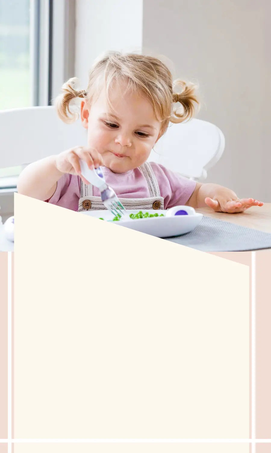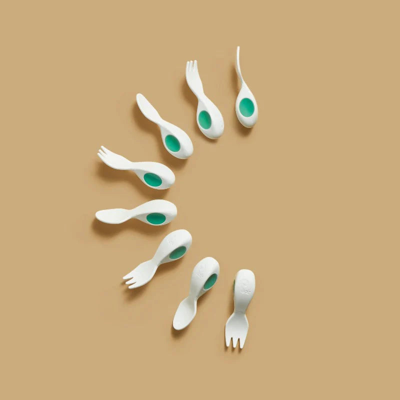 • Ergonomiškos, išformuotos rankenėlės patogiai guli mažose rankutėse ir padeda išlaikyti tinkamą įrankio kampą, kad maistas nenukristų iki pasiekiant burną.